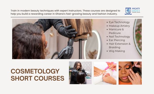 Transform your passion for beauty into a professional career with our Cosmetology Short Courses. This hands-on training programme covers all aspects of modern beauty care, including Eye Technology, Makeup Artistry, Manicure and Pedicure, Nail Technology, Ear Piercing, Hair Extension and Braiding, and Wig Making. Students gain practical experience using industry-standard tools and techniques under the guidance of experienced beauty professionals. The course equips you with the confidence to work in salons, beauty studios, or even start your own beauty business. Graduates leave prepared to meet the growing demand for skilled beauty and cosmetology experts in Ghana and beyond.
