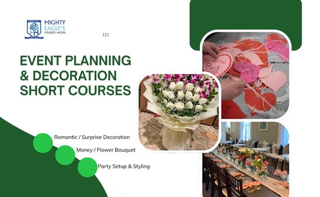 Turn your passion for celebrations into a rewarding profession with our Event Planning and Decoration Short Course. This programme provides practical training in creative event design, organization, and decoration. Students learn how to execute stunning Romantic and Surprise Decorations, Money and Flower Bouquets, and Party Setups that make every occasion memorable. With guidance from experienced event planners, learners gain the confidence and skills to manage events from start to finish. Graduates can build successful businesses as event planners, decorators, or celebration stylists across Ghana’s growing event industry.